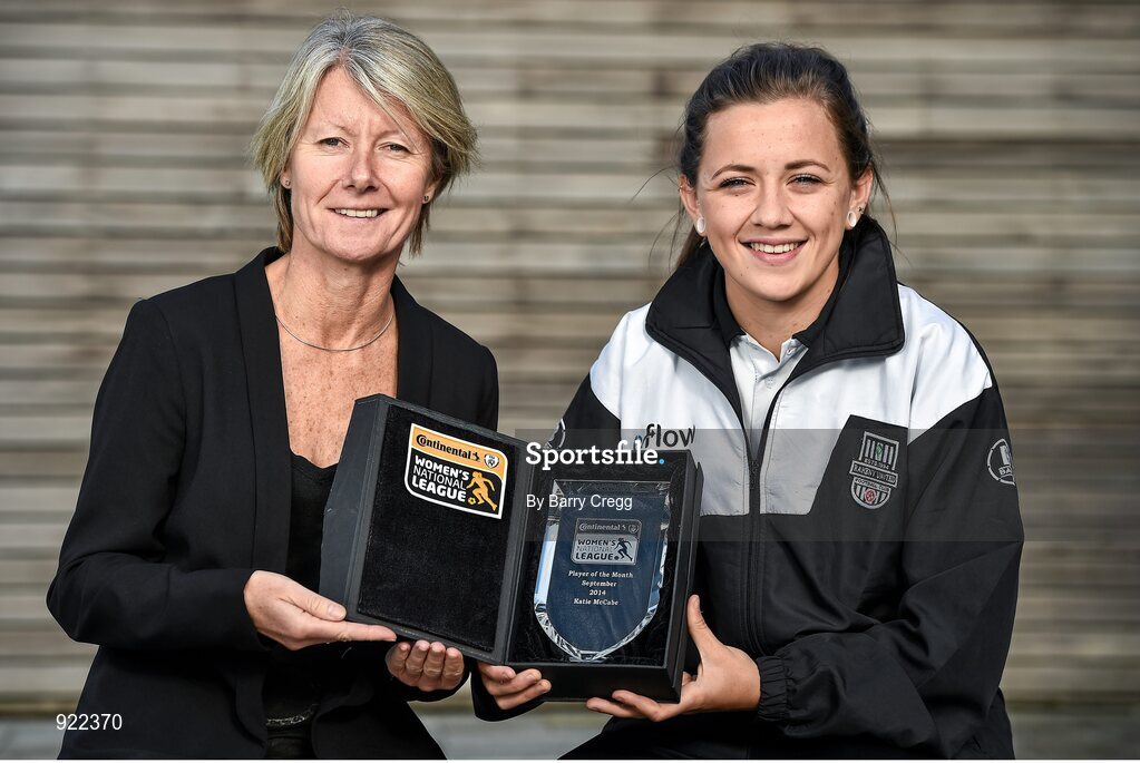6 October 2014; Raheny United's Katie McCabe receives the Continental Tyres Women's National League Player of the Month Award for September from Sue Ronan, Republic of Ireland women’s international team manager. FAI Headquarters, Abbotstown, Dublin. Picture credit: Barry Cregg / SPORTSFILE