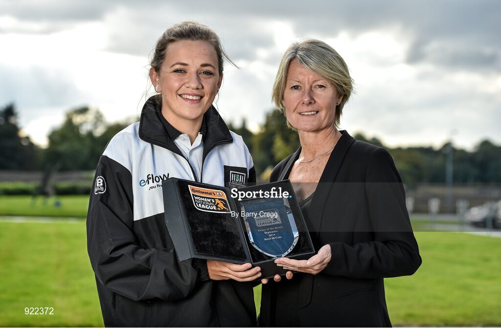 6 October 2014; Raheny United's Katie McCabe receives the Continental Tyres Women's National League Player of the Month Award for September from Sue Ronan, Republic of Ireland women’s international team manager. FAI Headquarters, Abbotstown, Dublin. Picture credit: Barry Cregg / SPORTSFILE