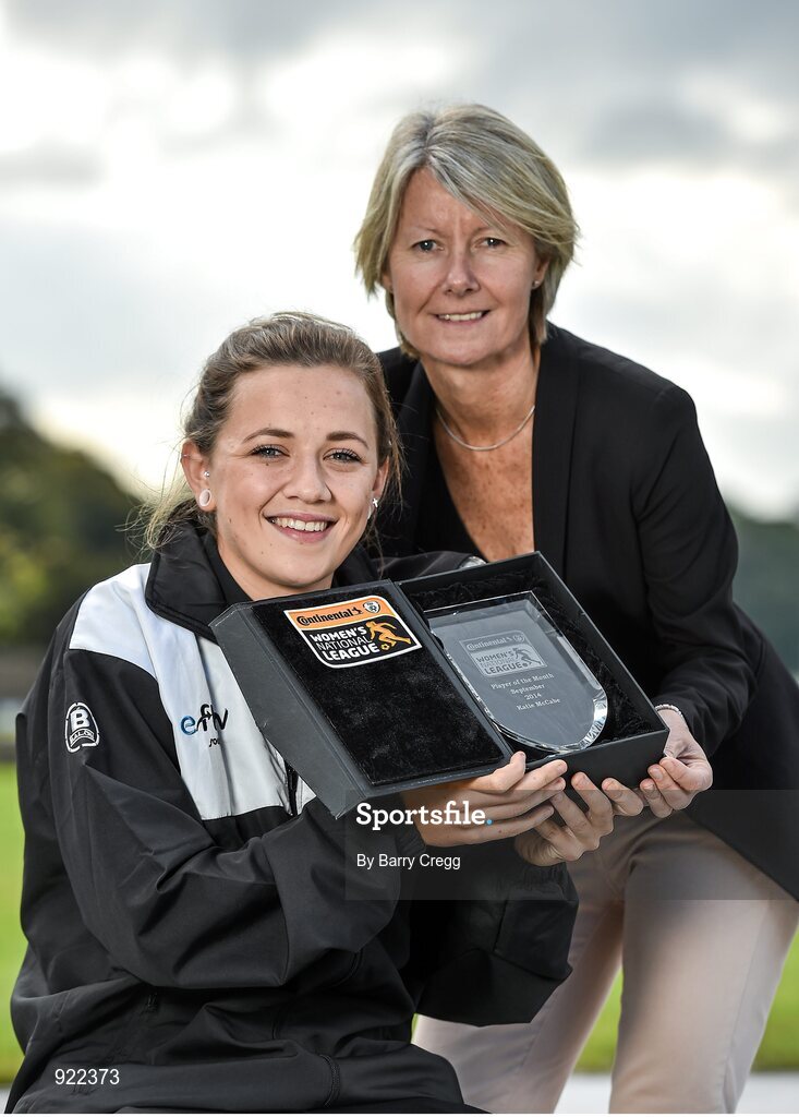 6 October 2014; Raheny United's Katie McCabe receives the Continental Tyres Women's National League Player of the Month Award for September from Sue Ronan, Republic of Ireland women’s international team manager. FAI Headquarters, Abbotstown, Dublin. Picture credit: Barry Cregg / SPORTSFILE