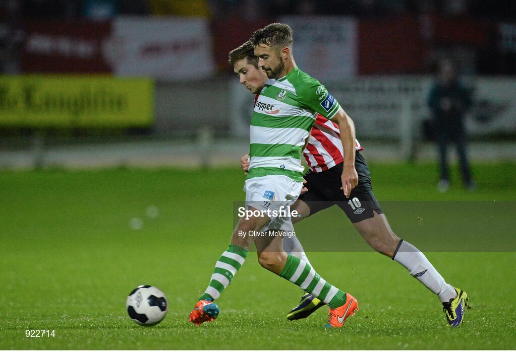 7 October 2014; Stephen McPhail, Shamrock Rovers, in action against Patrick McEleney, Derry City. FAI Ford Cup Semi-Final Replay, Derry City v Shamrock Rovers, Brandywell, Derry. Picture credit: Oliver McVeigh / SPORTSFILE