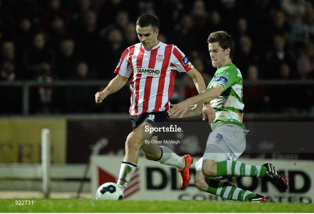 7 October 2014; Michael Duffy, Derry City, on his way to scoring his side's first goal despite the attempts of David O'Connor, Shamrock Rovers. FAI Ford Cup Semi-Final Replay, Derry City v Shamrock Rovers, Brandywell, Derry. Picture credit: Oliver McVeigh / SPORTSFILE