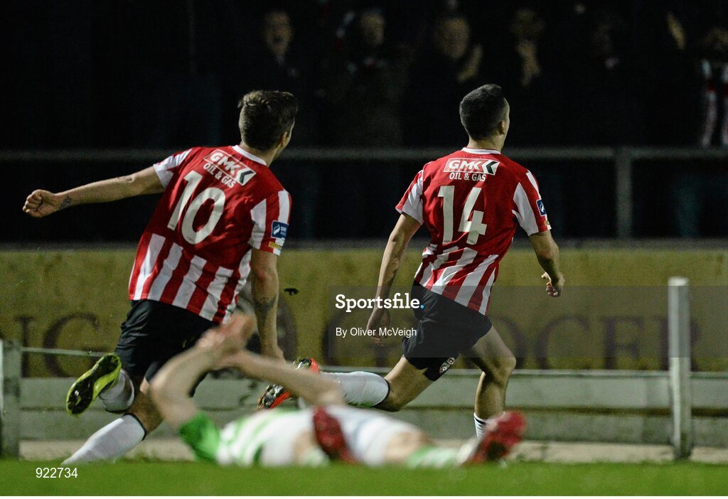 7 October 2014; Derry City's Michael Duffy, 14, celebrates after scoring his side's first goal. FAI Ford Cup Semi-Final Replay, Derry City v Shamrock Rovers, Brandywell, Derry. Picture credit: Oliver McVeigh / SPORTSFILE