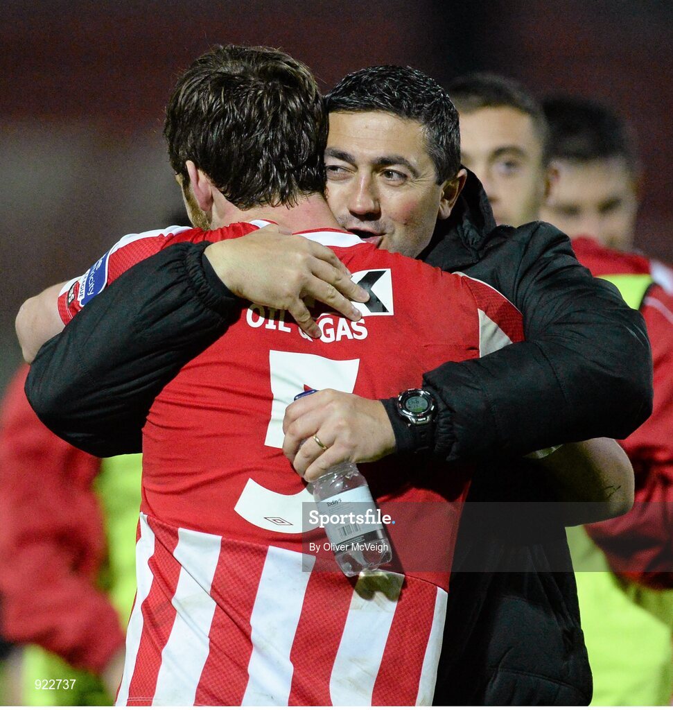7 October 2014; Derry City manager Peter Hutton and Ryan McBride celebrate after the final whistle. FAI Ford Cup Semi-Final Replay, Derry City v Shamrock Rovers, Brandywell, Derry. Picture credit: Oliver McVeigh / SPORTSFILE