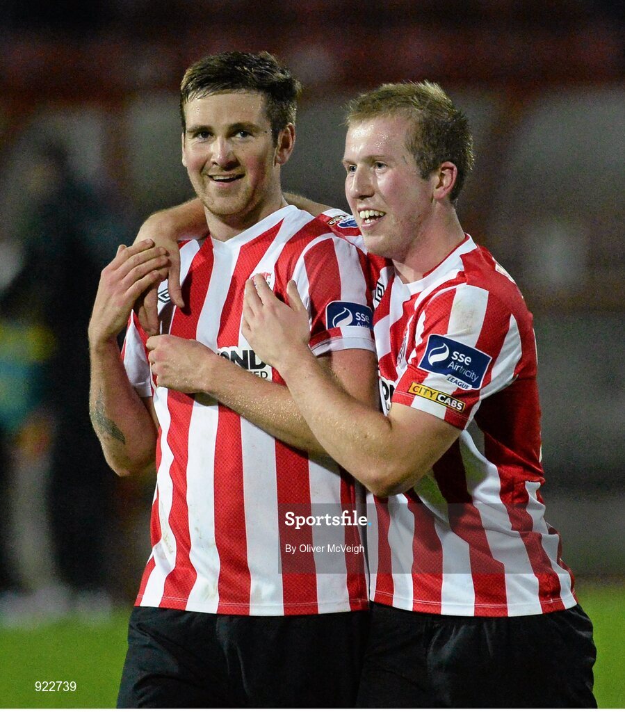 7 October 2014; Patrick McEleney, left, and Stephen Dooley, Derry City, celebrate after the game. FAI Ford Cup Semi-Final Replay, Derry City v Shamrock Rovers, Brandywell, Derry. Picture credit: Oliver McVeigh / SPORTSFILE