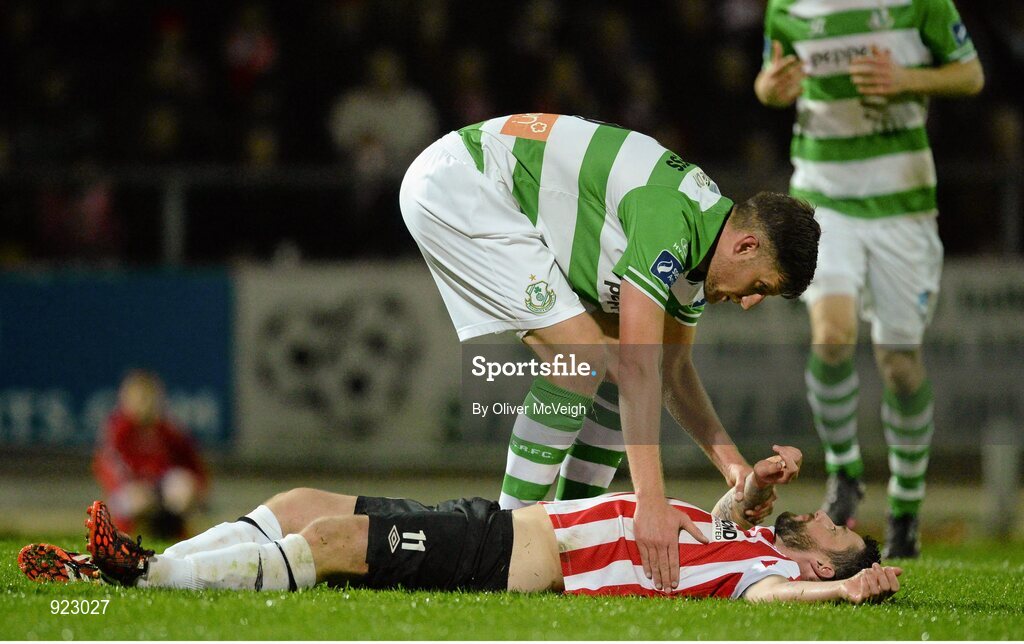 7 October 2014; Jason McGuinness, Shamrock Rovers, attends to Rory Patterson, Derry City, after he received an injury. FAI Ford Cup Semi-Final Replay, Derry City v Shamrock Rovers, Brandywell, Derry. Picture credit: Oliver McVeigh / SPORTSFILE
