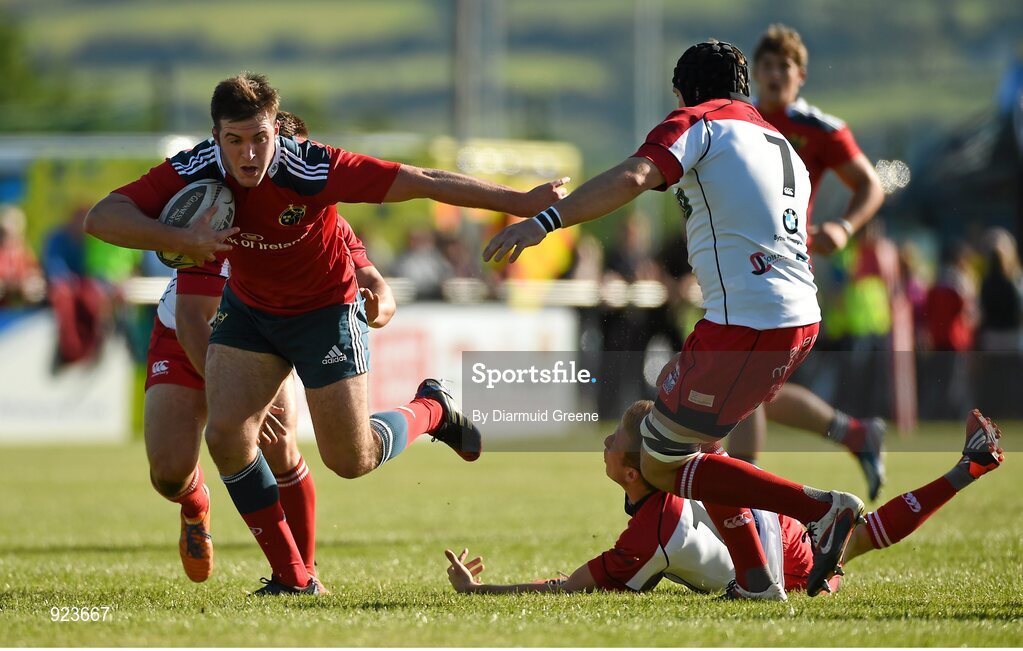 11 October 2014; Niall Kenneally, Munster A, gets away from Charley Thomas and Drew Cheshire, Moseley. British & Irish Cup, Round 1, Munster A v Moseley. Clonmel RFC, Clonmel, Co. Tipperary. Picture credit: Diarmuid Greene / SPORTSFILE