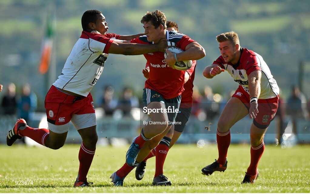 11 October 2014; Dan Goggin, Munster A, is tackled by Danny Hobbs-Awoyemi, left, and Scott Armstrong, Moseley. British & Irish Cup, Round 1, Munster A v Moseley. Clonmel RFC, Clonmel, Co. Tipperary. Picture credit: Diarmuid Greene / SPORTSFILE