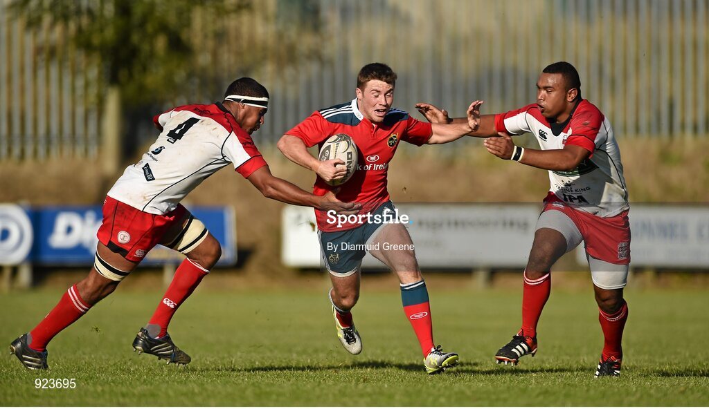 11 October 2014; Luke O'Dea, Munster A, is tackled by Nile Dacres, left, and Danny Hobbs-Awoyemi, Moseley. British & Irish Cup, Round 1, Munster A v Moseley. Clonmel RFC, Clonmel, Co. Tipperary. Picture credit: Diarmuid Greene / SPORTSFILE