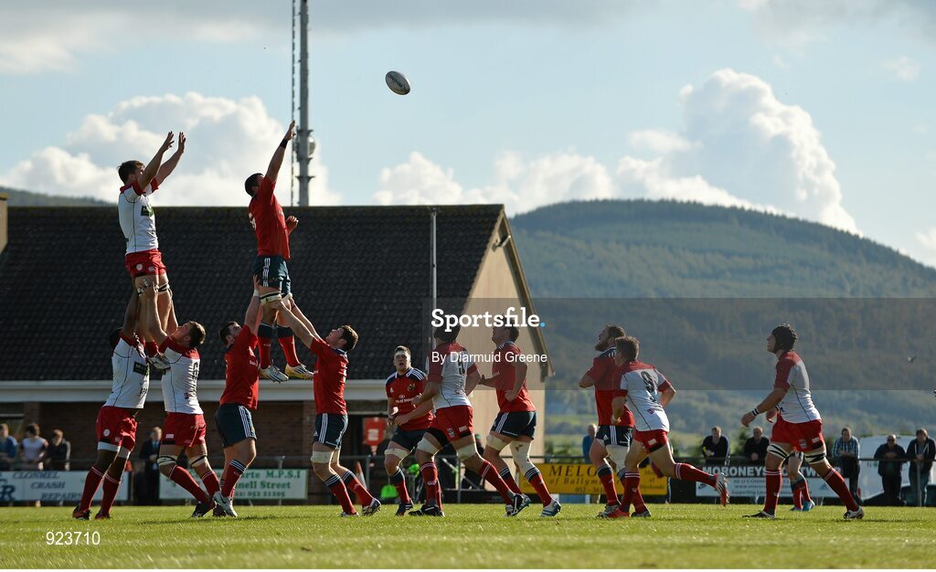 11 October 2014; Paddy Butler, Munster A, wins possession in a lineout ahead of Ed Siggery, Moseley. British & Irish Cup, Round 1, Munster A v Moseley. Clonmel RFC, Clonmel, Co. Tipperary. Picture credit: Diarmuid Greene / SPORTSFILE