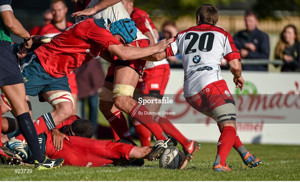 11 October 2014; Paddy Butler, Munster A, supported by team-mate Darragh Moloney, scores his side's second try. British & Irish Cup, Round 1, Munster A v Moseley. Clonmel RFC, Clonmel, Co. Tipperary. Picture credit: Diarmuid Greene / SPORTSFILE