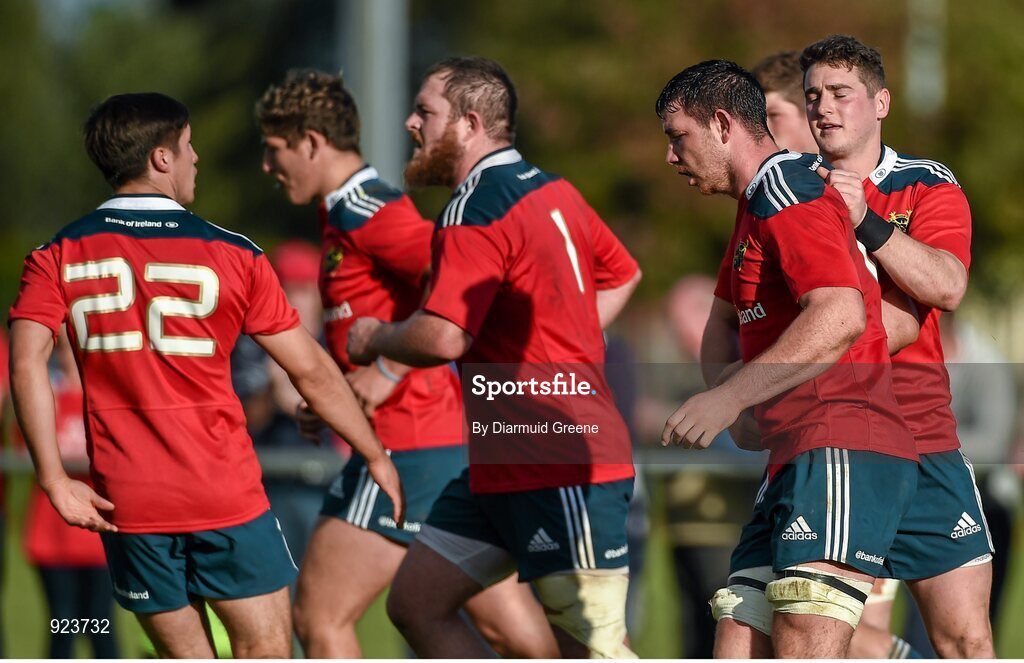 11 October 2014; Paddy Butler, Munster A, is congratulated by team-mates, Ronan O'Mahony, right, and Greg O'Shea, left, after scoring his side's second try. British & Irish Cup, Round 1, Munster A v Moseley. Clonmel RFC, Clonmel, Co. Tipperary. Picture credit: Diarmuid Greene / SPORTSFILE