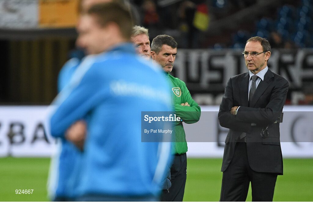 14 October 2014; Republic of Ireland manager Martin O'Neill and Assistant Manager Roy Keane, left, before the game. UEFA EURO 2016 Championship Qualifer, Group D, Germany v Republic of Ireland, Veltins Stadium, Gelsenkirchen, Germany. Picture credit: Pat Murphy / SPORTSFILE