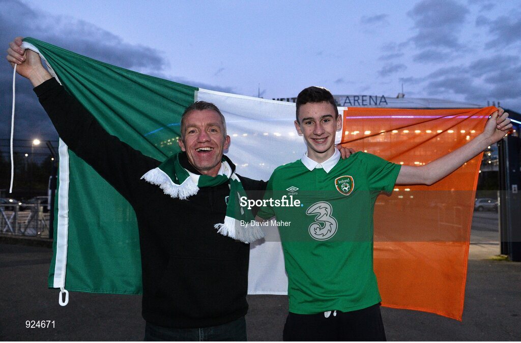 14 October 2014; Republic of Ireland supporters Barry Ring, left, with his son Luke, from Rush, Co. Dublin, ahead of the game. UEFA EURO 2016 Championship Qualifer, Group D, Germany v Republic of Ireland, Veltins Stadium, Gelsenkirchen, Germany. Picture credit: David Maher / SPORTSFILE