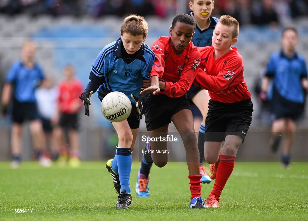 23 October 2014; Alex English, St. Mary's BNS, Booterstown, son of Tipperary hurling legend Nicky English, in action against Mustaf Ali Hassa and Brandon Hennessy, right, St. Patrick's SNS, Corduff. Allianz Cumann na mBunscol Finals, Croke Park, Dublin. Picture credit: Pat Murphy / SPORTSFILE