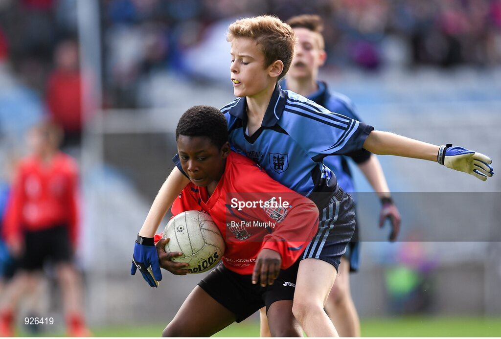23 October 2014; Warith Omotoso, St. Patrick's SNS, Corduff, in action against Alex O'Meara, St. Mary's BNS, Booterstown, during the Sciath Clanna Gael Final. Allianz Cumann na mBunscol Finals, Croke Park, Dublin. Picture credit: Pat Murphy / SPORTSFILE