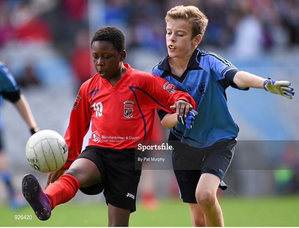 23 October 2014; Warith Omotoso, St. Patrick's SNS, Corduff, in action against Alex O'Meara, St. Mary's BNS, Booterstown, during the Sciath Clanna Gael Final. Allianz Cumann na mBunscol Finals, Croke Park, Dublin. Picture credit: Pat Murphy / SPORTSFILE