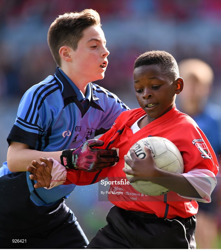 23 October 2014; Belguy Manzambi, St. Patrick's SNS, Corduff, in action against Conor Moriarty, St. Mary's BNS, Booterstown, during the Sciath Clanna Gael Final. Allianz Cumann na mBunscol Finals, Croke Park, Dublin. Picture credit: Pat Murphy / SPORTSFILE