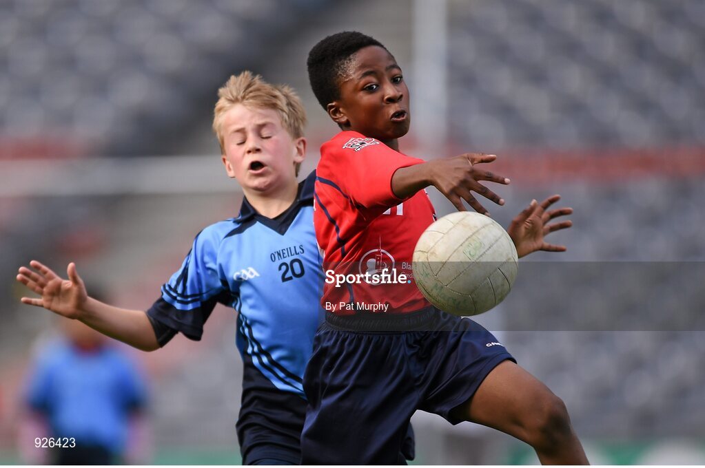 23 October 2014; David Loye, St. Patrick's SNS, Corduff, in action against Hugo McLaughlin, St. Mary's BNS, Booterstown, during the Sciath Clanna Gael Final. Allianz Cumann na mBunscol Finals, Croke Park, Dublin. Picture credit: Pat Murphy / SPORTSFILE