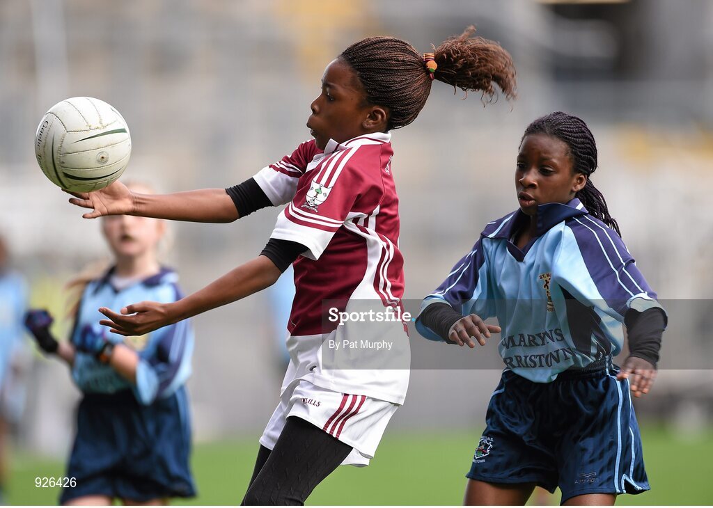 23 October 2014; Henrietta Igbinomwanhia, St. Luke's NS, Tyrrelstown, in action against Tomi Onasoga, St Mary's NS, Garristown, during the Corn Na Laoch Final. Allianz Cumann na mBunscol Finals, Croke Park, Dublin. Picture credit: Pat Murphy / SPORTSFILE