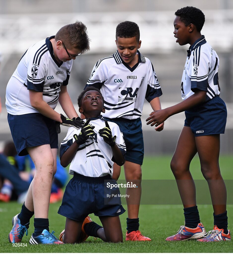 23 October 2014; Iminiu Tsalabiendze, St. Martin De Porres, Aylesbury, celebrates at the final whistle surrounded by team-mates, from left, Josh Hanley, Junior Ozhianvuna and Japhet Mbuenemo after winning the Corn Matt Griffin final. Allianz Cumann na mBunscol Finals, Croke Park, Dublin. Picture credit: Pat Murphy / SPORTSFILE