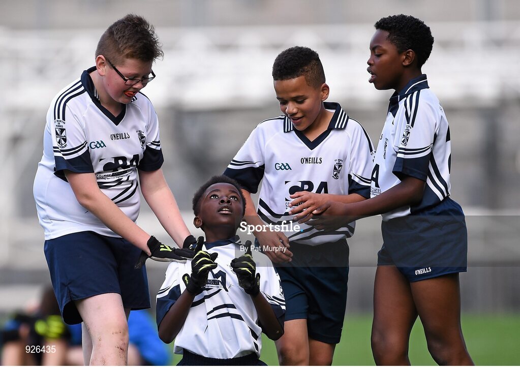 23 October 2014; Iminiu Tsalabiendze, St. Martin De Porres, Aylesbury, celebrates at the final whistle surrounded by team-mates, from left, Josh Hanley, Junior Ozhianvuna and Japhet Mbuenemo after winning the Corn Matt Griffin final. Allianz Cumann na mBunscol Finals, Croke Park, Dublin. Picture credit: Pat Murphy / SPORTSFILE