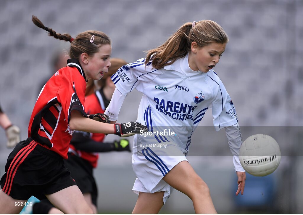 23 October 2014; Lauren Kearney, Bishop Galvin NS, Templeogue, in action against Rebecca Keane, St Colmcille's SNS, Knocklyon, left, during the Austin Finn Shield final. Allianz Cumann na mBunscol Finals, Croke Park, Dublin. Picture credit: Pat Murphy / SPORTSFILE