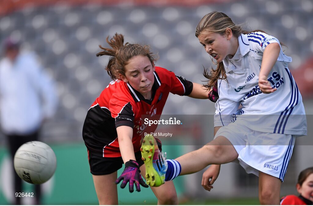 23 October 2014; Lauren Kearney, Bishop Galvin NS, Templeogue, in action against Sarah Gleeson, St Colmcille's SNS, Knocklyon, left, during the Austin Finn Shield final. Allianz Cumann na mBunscol Finals, Croke Park, Dublin. Picture credit: Pat Murphy / SPORTSFILE