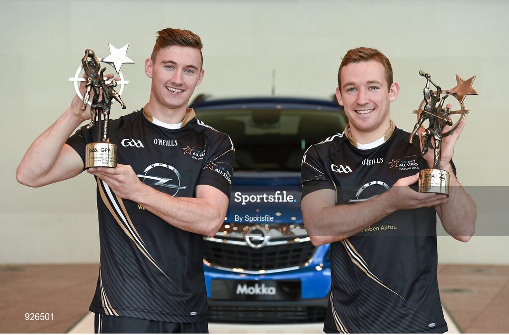 24 October 2014; Kerry footballer James O'Donoghue, left, and Kilkenny hurler Richie Hogan, right, with their 2014 GAA GPA All-Star Player of the Year awards. Convention Centre, Dublin. Photo by Sportsfile