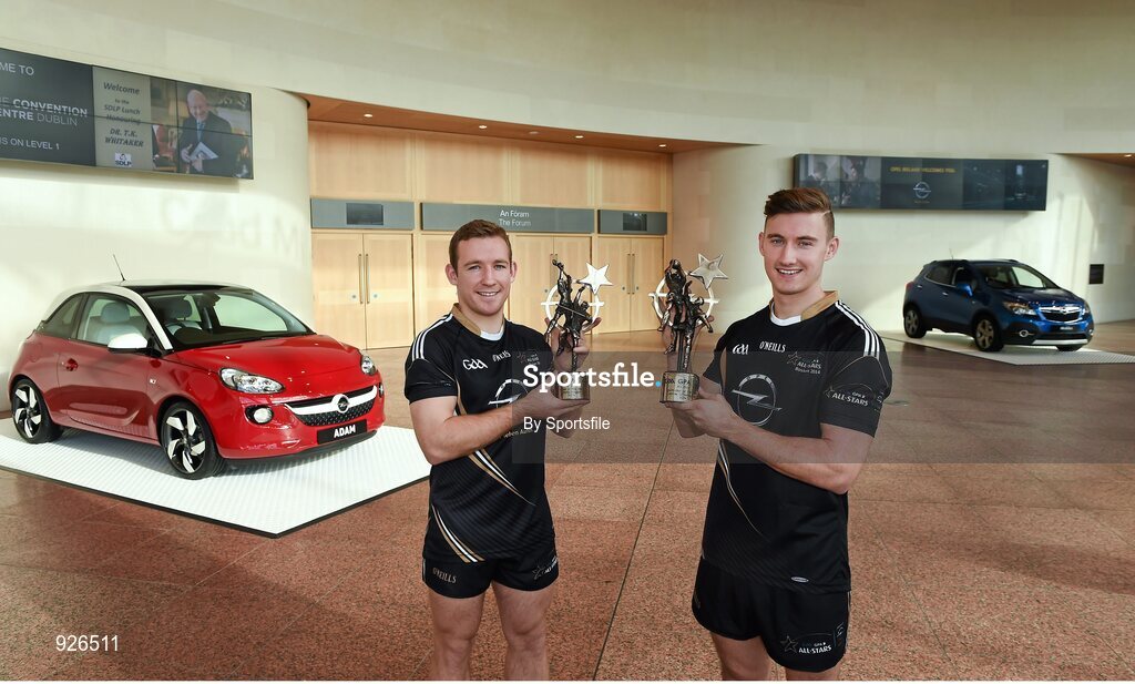 24 October 2014; Kerry footballer James O'Donoghue, right, and Kilkenny hurler Richie Hogan, with their 2014 GAA GPA All-Star Player of the Year awards. Convention Centre, Dublin. Photo by Sportsfile