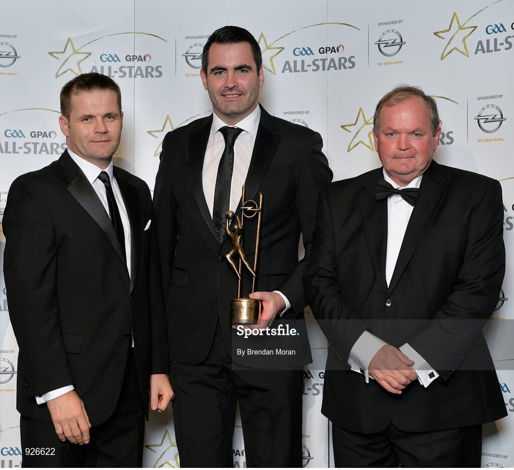 24 October 2014; Donegal footballer Paul Durcan is presented with his 2014 GAA GPA All-Star award by Uachtarán Chumann Lúthchleas Gael Liam Ó Néill and Dessie Farrell, Chief Executive of the Gaelic Players Association. GAA GPA All-Star Awards 2014 Sponsored by Opel. Convention Centre, Dublin. Picture credit: Brendan Moran / SPORTSFILE