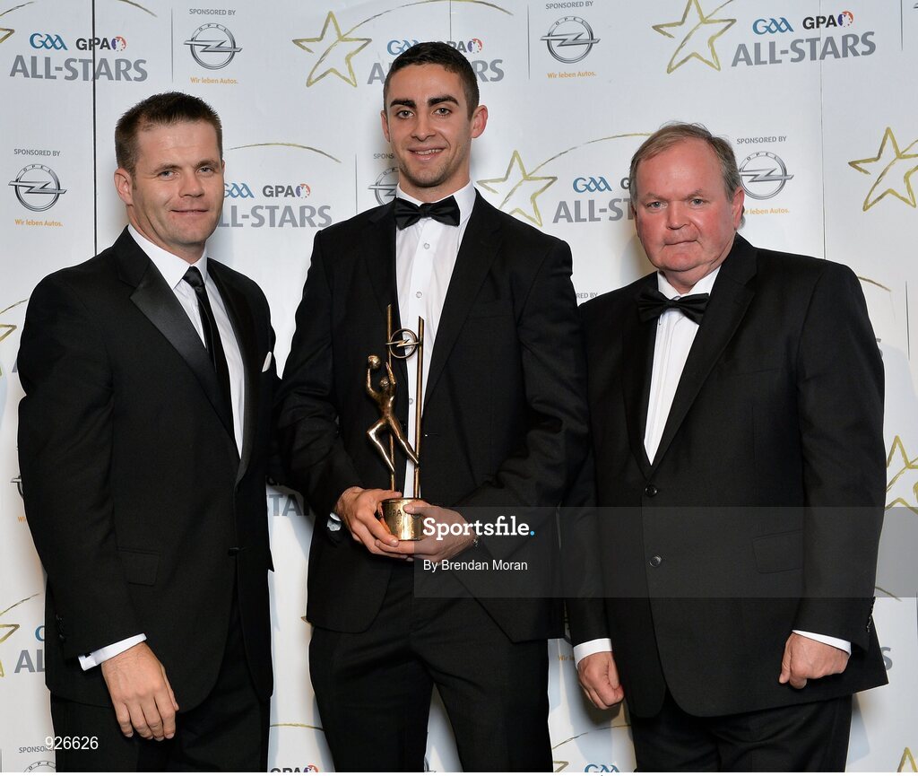 24 October 2014; Dublin footballer James McCarthy is presented with his 2014 GAA GPA All-Star award by Uachtarán Chumann Lúthchleas Gael Liam Ó Néill and Dessie Farrell, Chief Executive of the Gaelic Players Association. GAA GPA All-Star Awards 2014 Sponsored by Opel. Convention Centre, Dublin. Picture credit: Brendan Moran / SPORTSFILE