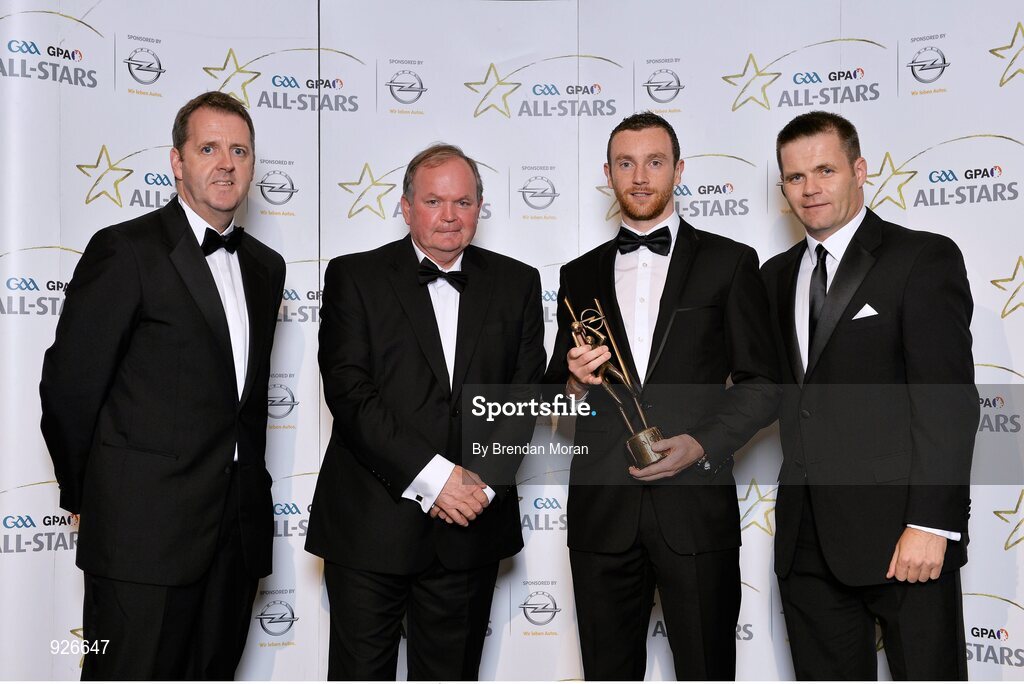 24 October 2014; Mayo footballer Keith Higgins is presented with his 2014 GAA GPA All-Star award by Uachtarán Chumann Lúthchleas Gael Liam Ó Néill, Dessie Farrell, Chief Executive of the Gaelic Players Association, and Dave Sheeran, Managing Director of Opel Ireland. GAA GPA All-Star Awards 2014 Sponsored by Opel. Convention Centre, Dublin. Picture credit: Brendan Moran / SPORTSFILE