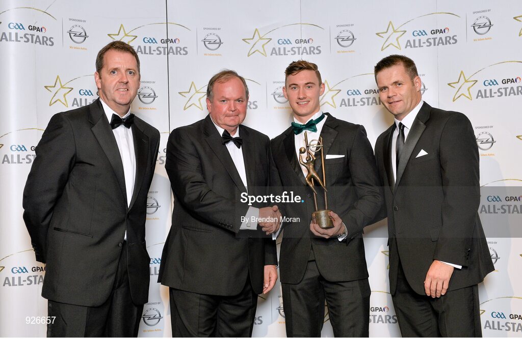 24 October 2014; Kerry footballer James O'Donoghue is presented with his 2014 GAA GPA All-Star award by Uachtarán Chumann Lúthchleas Gael Liam Ó Néill, Dessie Farrell, Chief Executive of the Gaelic Players Association, and Dave Sheeran, Managing Director of Opel Ireland. GAA GPA All-Star Awards 2014 Sponsored by Opel. Convention Centre, Dublin. Picture credit: Brendan Moran / SPORTSFILE
