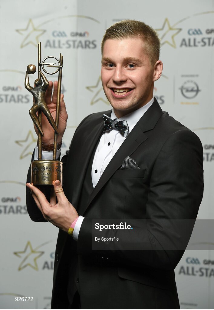 24 October 2014; Kerry footballer Peter Crowley with his 2014 GAA GPA All-Star award at the 2014 GAA GPA All-Star Awards, sponsored by Opel. Convention Centre, Dublin. Photo by Sportsfile