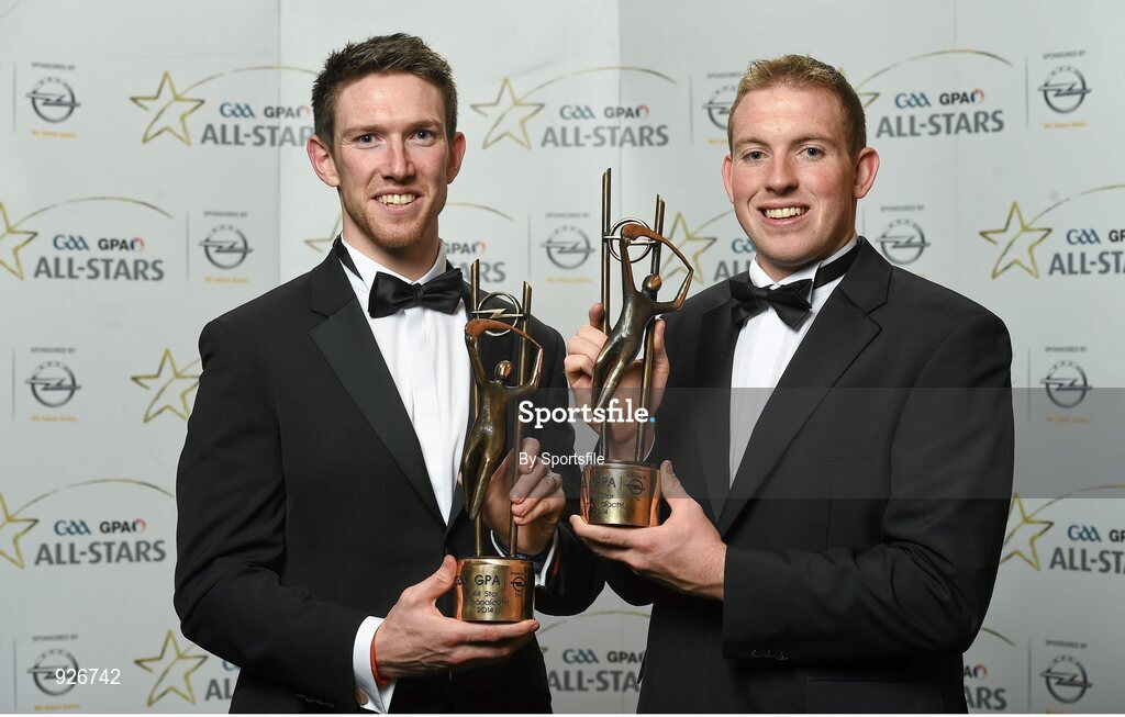 24 October 2014; Limerick hurlers Seamus Hickey, left, and Shane Dowling with their 2014 GAA GPA All-Star awards at the 2014 GAA GPA All-Star Awards, sponsored by Opel. Convention Centre, Dublin. Photo by Sportsfile