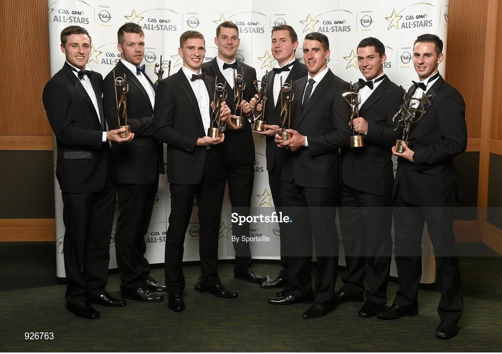 24 October 2014; Tipperary hurlers, from left, Shane McGrath, Padraic Maher, Brendan Maher, Seamus Callanan, Darren Gleeson, Patrick Maher, John O'Dwyer and Young Player of the Year Cathal Barrett with their 2014 GAA GPA All-Star awards at the 2014 GAA GPA All-Star Awards, sponsored by Opel. Convention Centre, Dublin. Photo by Sportsfile