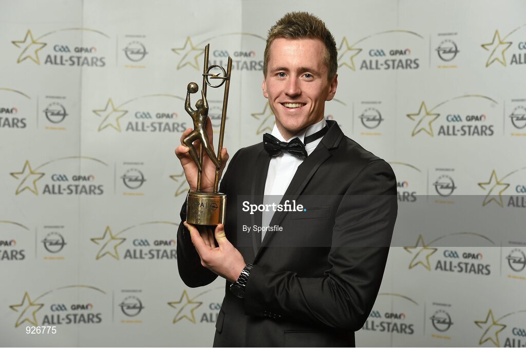 24 October 2014; Mayo footballer Cillian O'Connor with his 2014 GAA GPA All-Star award at the 2014 GAA GPA All-Star Awards, sponsored by Opel. Convention Centre, Dublin. Photo by Sportsfile