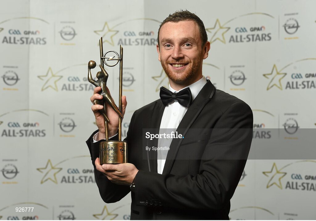 24 October 2014; Mayo footballer Keith Higgins with his 2014 GAA GPA All-Star award at the 2014 GAA GPA All-Star Awards, sponsored by Opel. Convention Centre, Dublin. Photo by Sportsfile