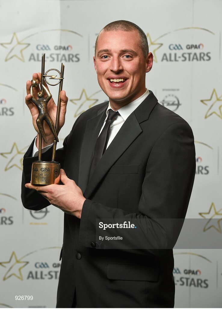 24 October 2014; Kerry footballer Kieran Donaghy with his 2014 GAA GPA All-Star award at the 2014 GAA GPA All-Star Awards, sponsored by Opel. Convention Centre, Dublin. Photo by Sportsfile