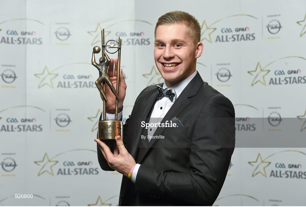 24 October 2014; Kerry footballer Peter Crowley with his 2014 GAA GPA All-Star award at the 2014 GAA GPA All-Star Awards, sponsored by Opel. Convention Centre, Dublin. Photo by Sportsfile