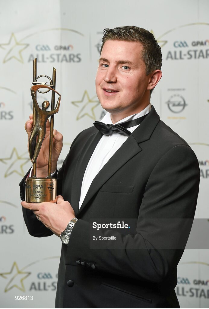 24 October 2014; Tipperary hurler Darren Gleeson with his 2014 GAA GPA All-Star award at the 2014 GAA GPA All-Star Awards, sponsored by Opel. Convention Centre, Dublin. Photo by Sportsfile
