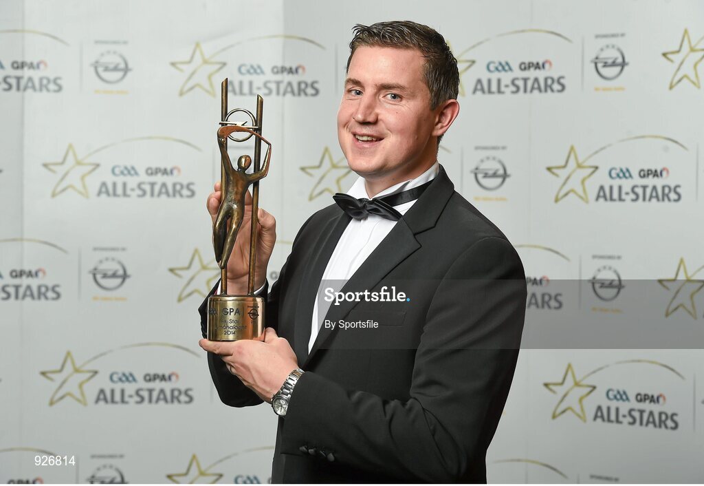 24 October 2014; Tipperary hurler Darren Gleeson with his 2014 GAA GPA All-Star award at the 2014 GAA GPA All-Star Awards, sponsored by Opel. Convention Centre, Dublin. Photo by Sportsfile