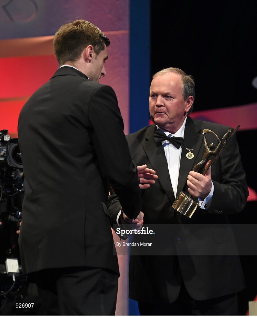 24 October 2014; Shane McGrath, Tipperary, is presented with his All-Star award by Uachtarán Chumann Lúthchleas Gael Liam Ó Néill, during the 2014 GAA GPA All-Star Awards, sponsored by Opel. Convention Centre, Dublin. Picture credit: Brendan Moran / SPORTSFILE