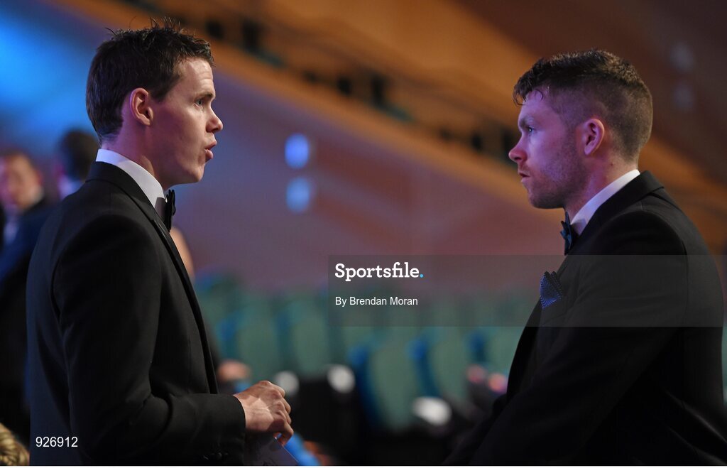24 October 2014; Kilkenny's TJ Reid, left, in conversation with Padraic Maher, Tipperary, during the 2014 GAA GPA All-Star Awards, sponsored by Opel. Convention Centre, Dublin. Picture credit: Brendan Moran / SPORTSFILE