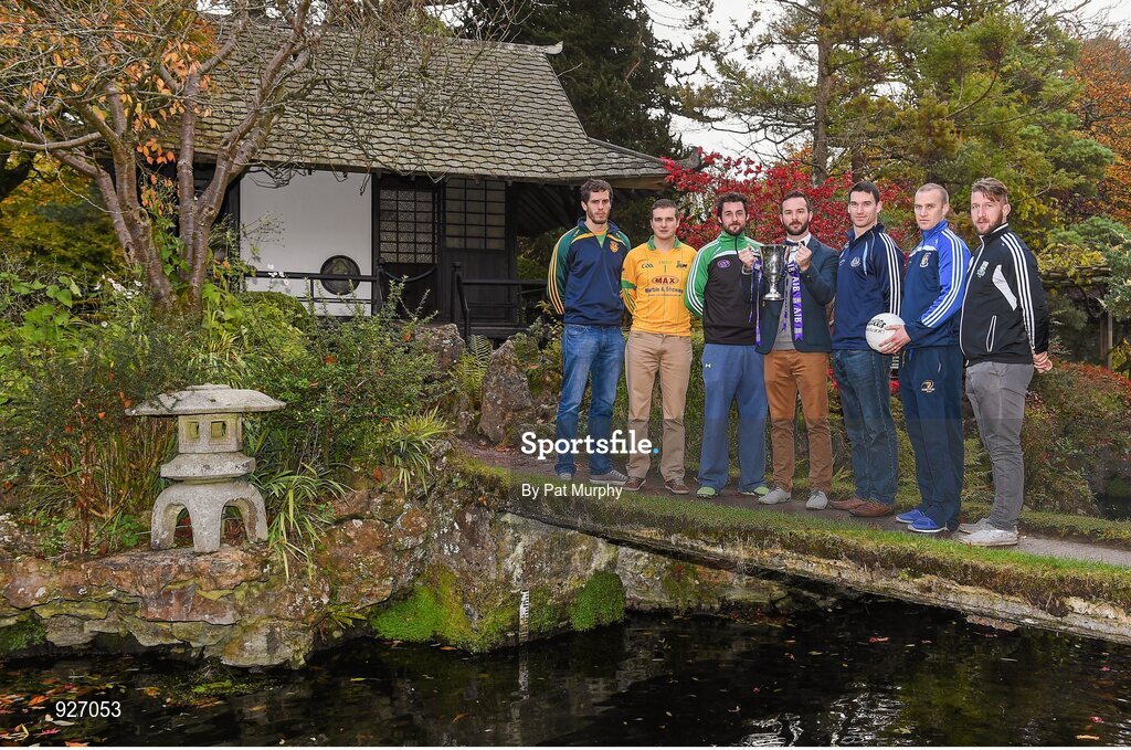 25 October 2014; The Leinster GAA Club Championship was launched today, hosted by Irish National Stud and Gardens. Pictured at the launch are football club captains, from left, Brendan Murphy, Rathvilly, Co. Carlow, Kenneth Garry, vice-captain, Rhode, Co. Offaly, Joe McCormack, Emmet Og Killoe, Co. Longford, Ben Finnegan, AIB Marketing, Dessie Brennan, Eadestown GAA, Niall McKeigue, Navan O'Mahony's, Co. Meath, and Cahir Healy, Portlaoise, Co. Laois. Irish National Stud and Japanese Gardens, Tully, Co. Kildare. Picture credit: Pat Murphy / SPORTSFILE
