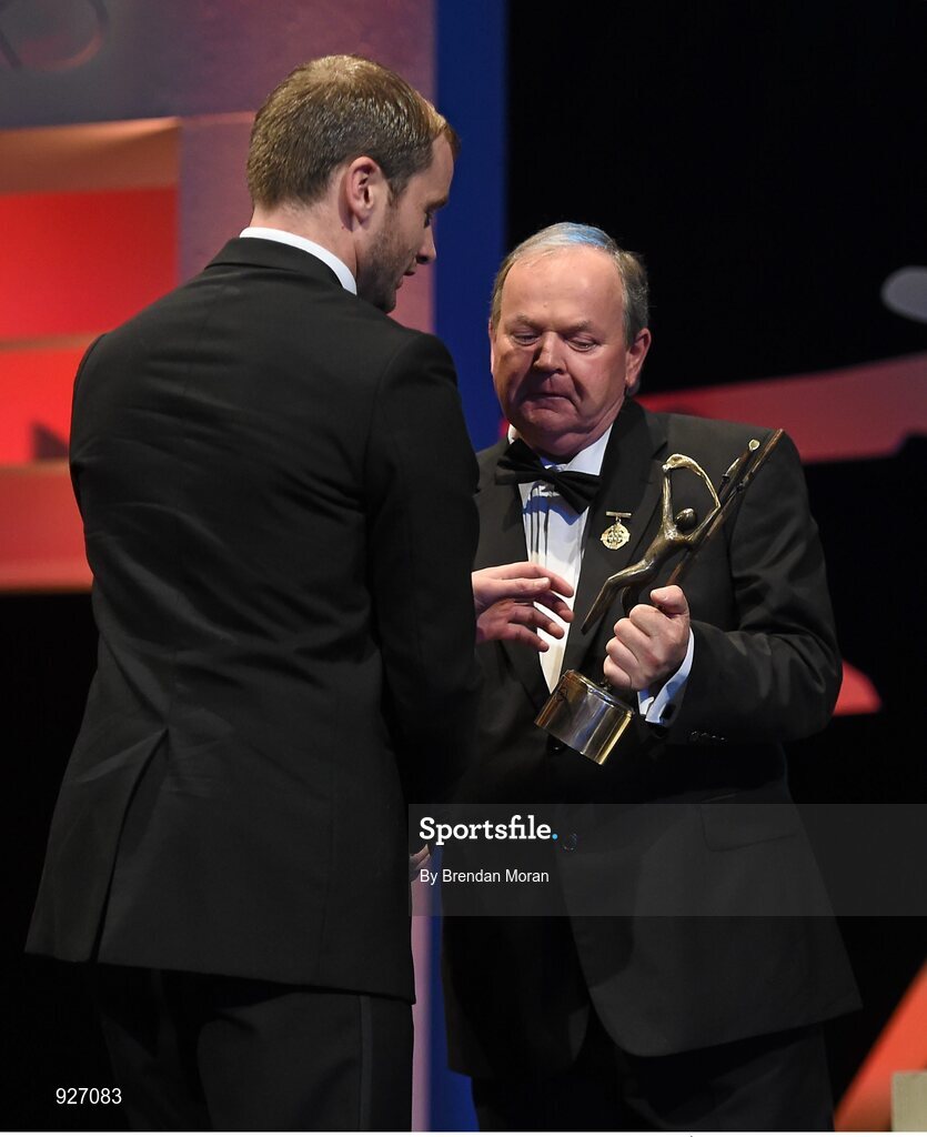 24 October 2014; JJ Delaney, Kilkenny, is presented with his All-Star award by Uachtarán Chumann Lúthchleas Gael Liam Ó Néill during the 2014 GAA GPA All-Star Awards, sponsored by Opel. Convention Centre, Dublin. Picture credit: Brendan Moran / SPORTSFILE