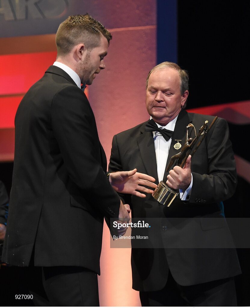 24 October 2014; Padraic Maher, Tipperary, is presented with his All-Star award by Uachtarán Chumann Lúthchleas Gael Liam Ó Néill during the 2014 GAA GPA All-Star Awards, sponsored by Opel. Convention Centre, Dublin. Picture credit: Brendan Moran / SPORTSFILE