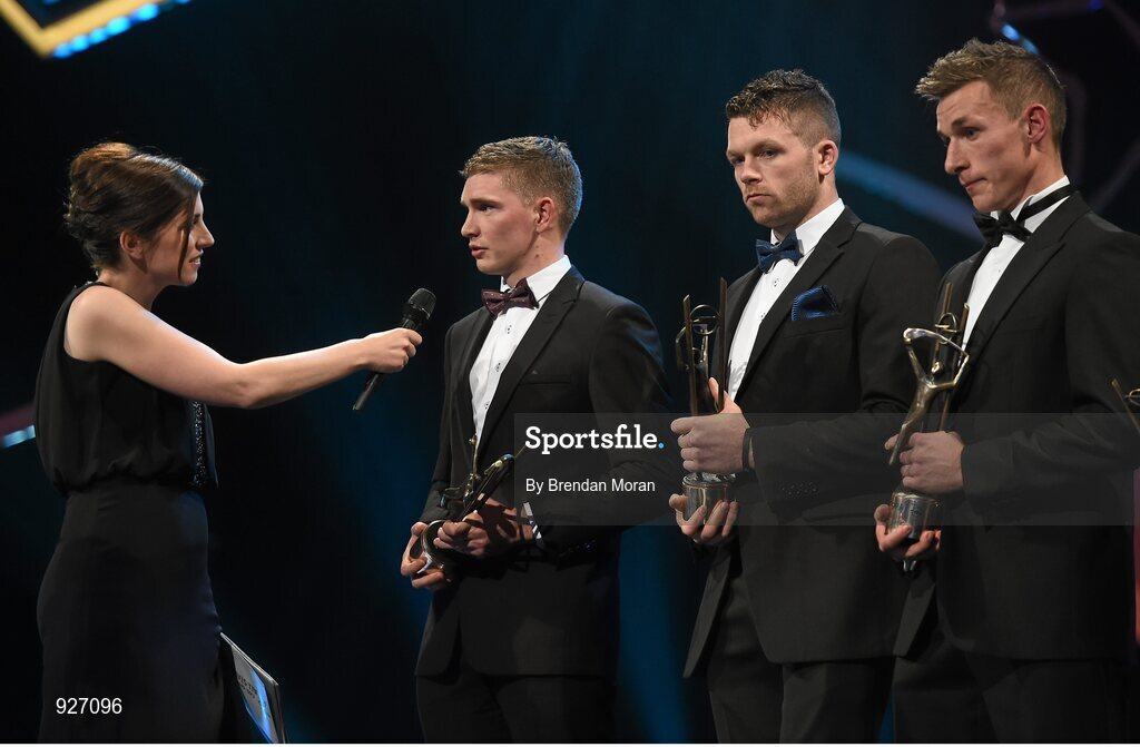 24 October 2014; Brendan Maher, Tipperary, in the company of team-mate Padraic Maher, centre, and Cillian Buckley, Kilkenny, is interviewed by Mc Joanne Cantwell during the 2014 GAA GPA All-Star Awards, sponsored by Opel. Convention Centre, Dublin. Picture credit: Brendan Moran / SPORTSFILE