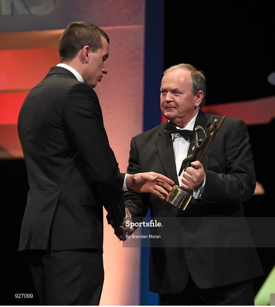 24 October 2014; Patrick Maher, Tipperary, is presented with his All-Star award by Uachtarán Chumann Lúthchleas Gael Liam Ó Néill during the 2014 GAA GPA All-Star Awards, sponsored by Opel. Convention Centre, Dublin. Picture credit: Brendan Moran / SPORTSFILE