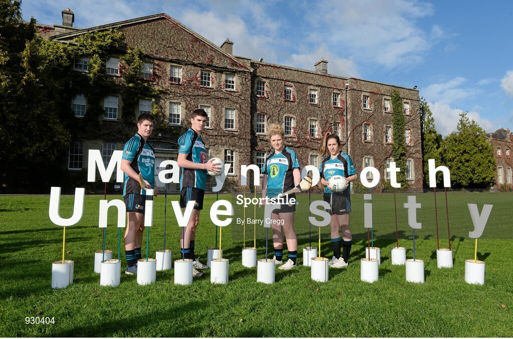 4 November 2014; Today Maynooth University GAA club launched its brand new team kit for their football, hurling, camogie and ladies football teams. In attendence are from left, Galway minor hurler Éanna Burke, Kildare footballer David Hyland, Sarah Ann Quinlan and Westmeath footballer Karen Hegarty, during the Maynooth University GAA Club Kit Launch. Maynooth University GAA Club Kit Launch 2014/2015, North Campus, Maynooth University. Picture credit: Barry Cregg / SPORTSFILE